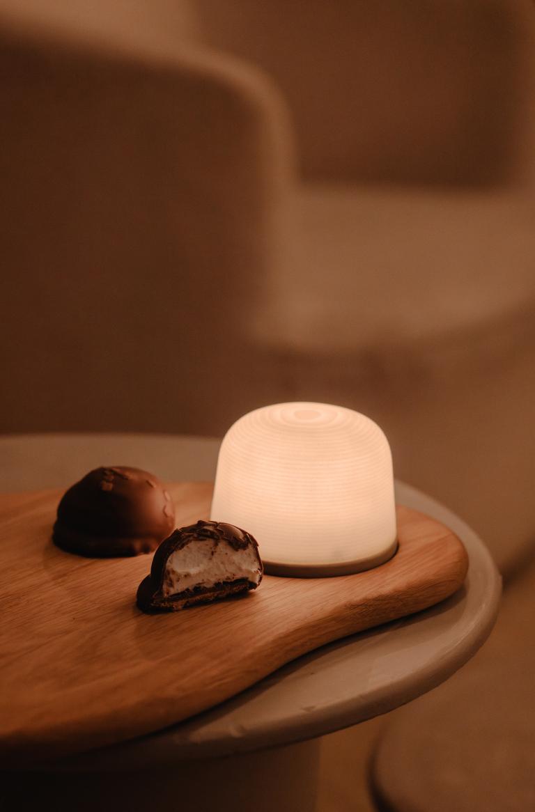 Deze stijlvolle lampjes, gemaakt van gerecycled materiaal, zijn geïnspireerd op de “melo cake” – een knipoog naar de oorsprong van Atelier Pierre in de patisserie van Lieven Vanhalst, zoon van “Pierre” Vanhalst.