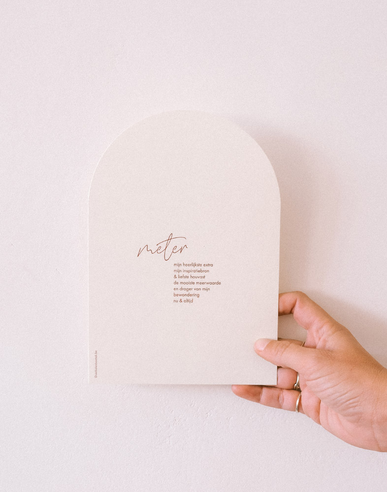 De warme woorden die je zoekt. Maar misschien niet meteen vindt. Voor de meter van je grootste kostbaarheid. Om haar te vertellen hoe erg je haar waardeert, hoe je haar bewondert, hoe je haar koestert. Of om de grote vraag te stellen. In een groot formaat, omdat het niet zomaar een kaartje is. Helemaal klaar voor aan de muur, op de kast of naast het bed.